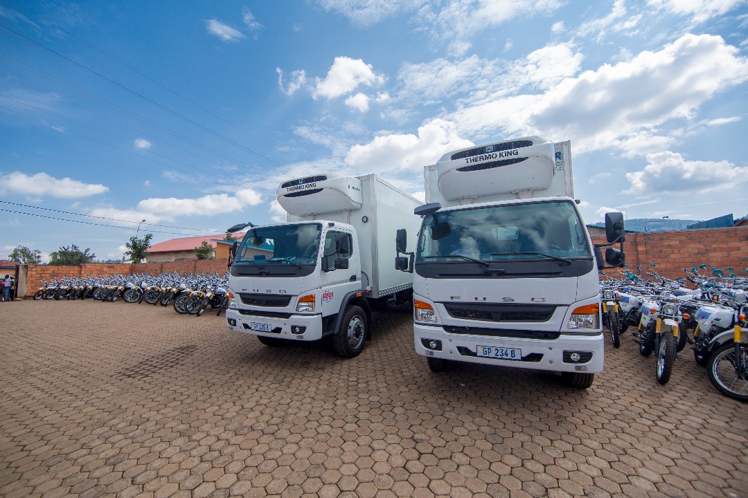 Alongside the motorcycles two refrigerated trucks to transfer vaccines were given to Rwanda Biomedical centre to ensure safety of vaccines right from the airport to their destination. Also 504 computers were given to health centres.